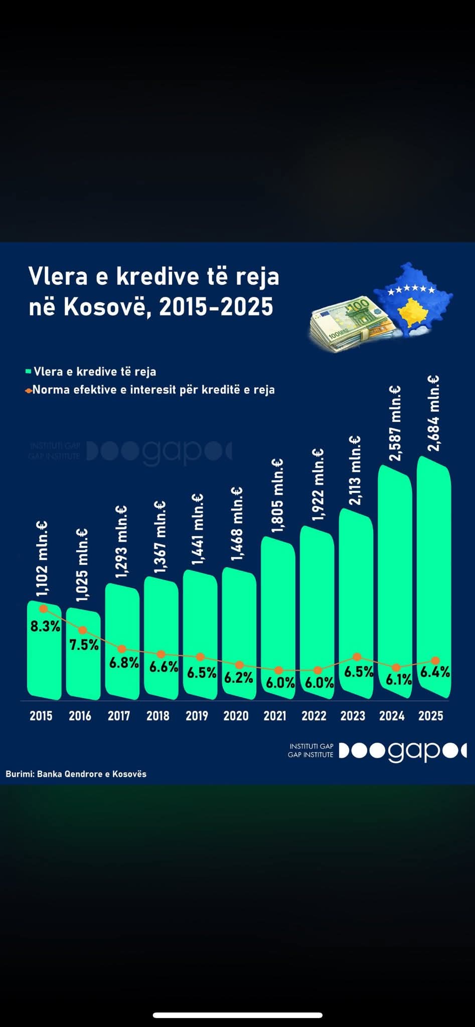 “Trendi i rritjes së kredive ka vazhduar edhe gjatë vitit 2025”, thekson Murtezi, duke iu referuar raportit të Institutit GAP, i cili bazohet në të dhënat e BQK-së.