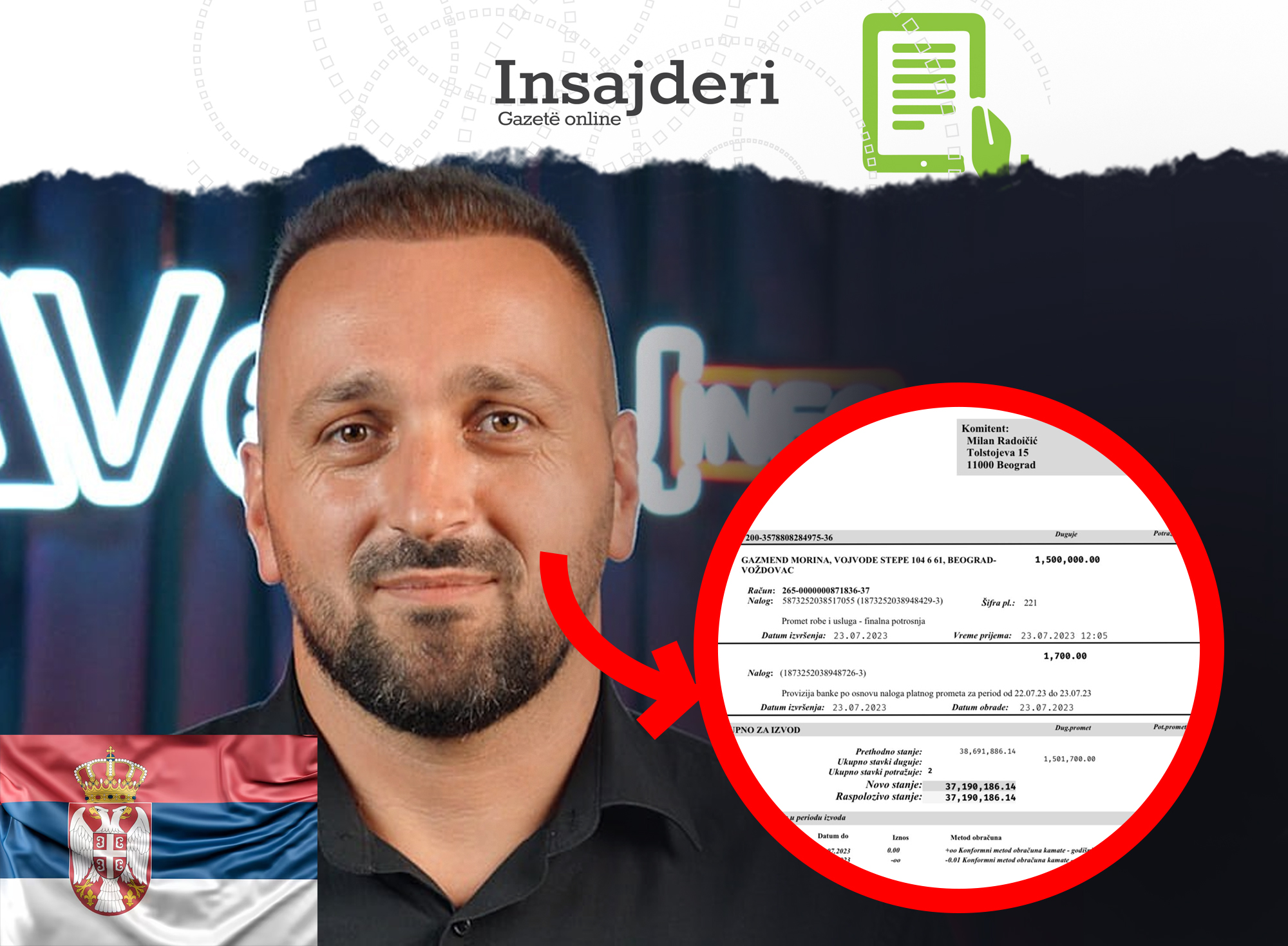 Sipas dokumentit të siguruar në kuadër të këtij hulumtimi investigator, pronari i portalit “Veriu Info”, Gazmend Morina dyshohet se ka pranuar një shumë të madhe parash përmes një banke në Beograd. Transferi është kryer nga një kompani e regjistruar në Serbi, e cila është e përfaqësuar nga biznesmeni Milan Radoićić, emër i njohur në zhvillimet politike rajonale.