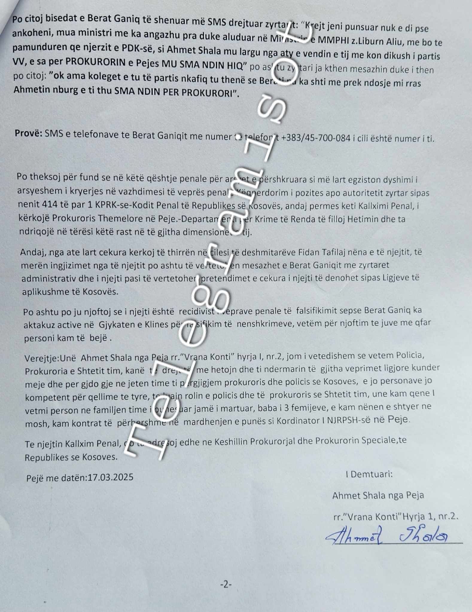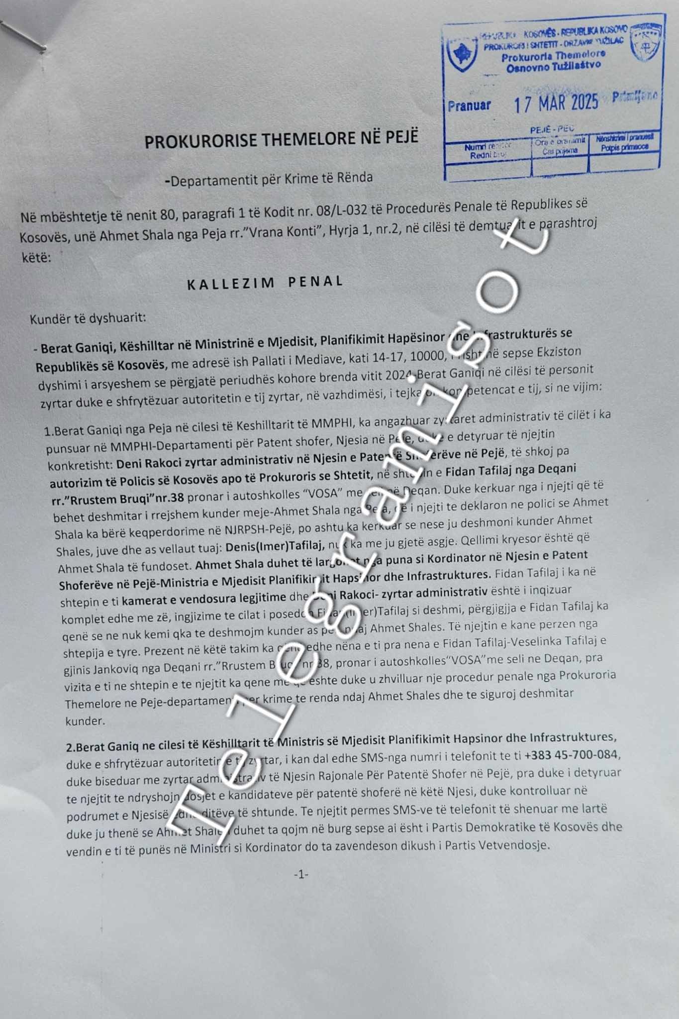 “Telegrami Sot” ka siguruar një kallëzim penal të bërë nga Ahmet Shala kundër Berat Ganiqit dhe disa zyrtarëve të tjerë të punësuar nga VV. Kallëzimi, i protokolluar më 17 mars 2025 në Prokurorinë Themelore në Pejë, akuzon Ganiqin për keqpërdorim të pozitës dhe detyrimit të dëshmitarëve për dëshmi të rreme.